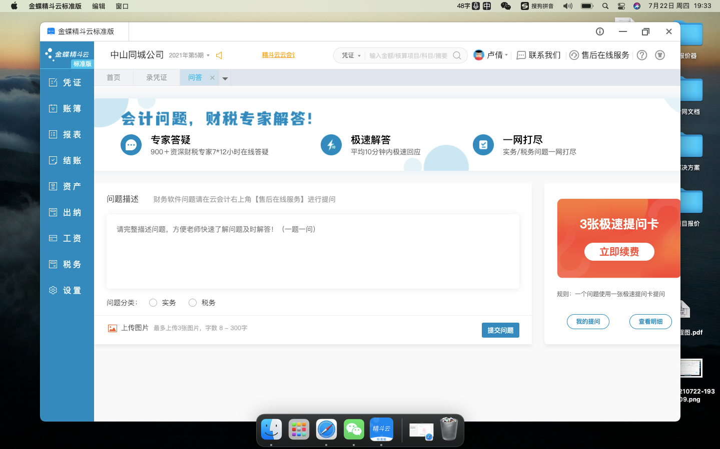 金蝶精斗云的迷你版、標準版產品,在錄憑證、查憑證、明細賬、科目余額表、結賬等財會最常使用的產品功能界面上提供【會計問題,專家解答】按鈕,用戶點擊按鈕即可一鍵發(fā)起提問。系統(tǒng)默認向新使用問答服務的賬套贈送3張問答卡。