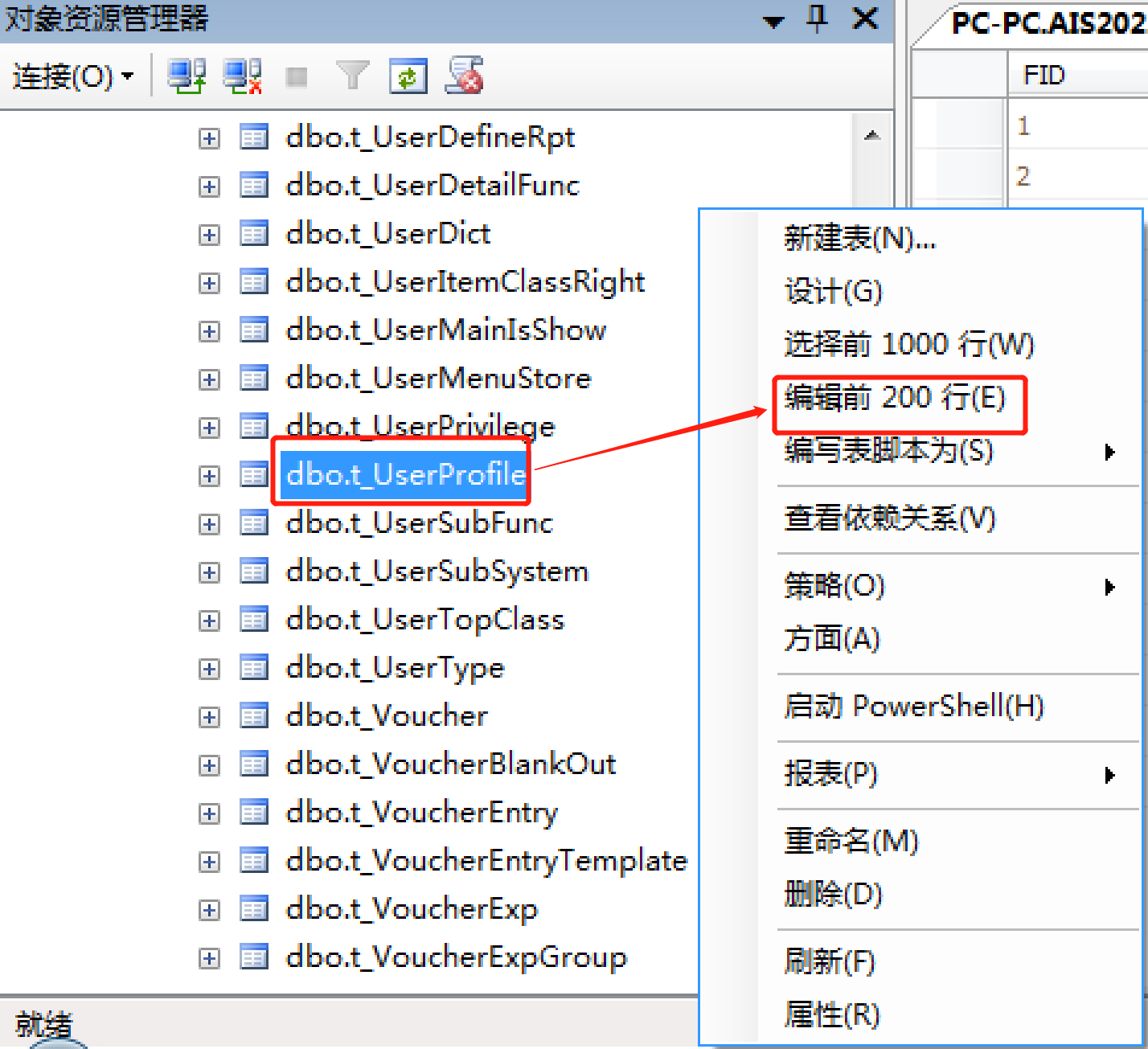1、登錄數據庫,賬套——表——t_userprofile表——鼠標“右鍵”——編輯前200行;