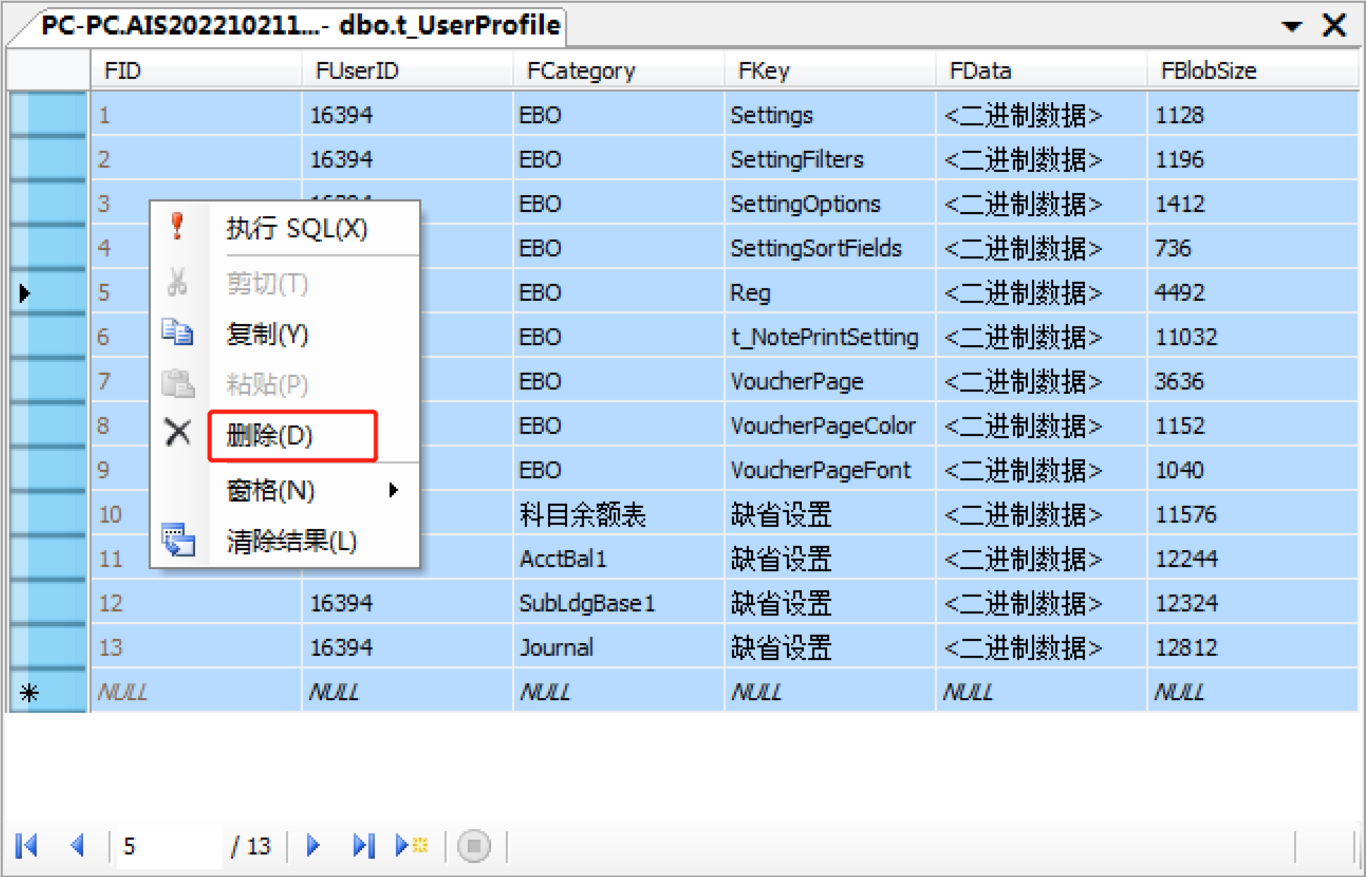 2、userprofile表界面 選中所有行——鼠標“右鍵”——刪除——點 “是”;